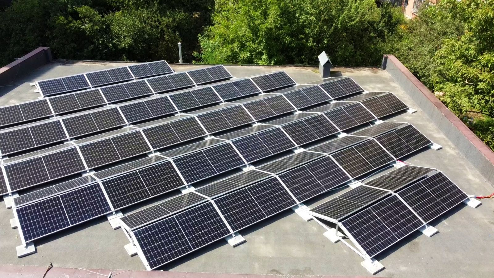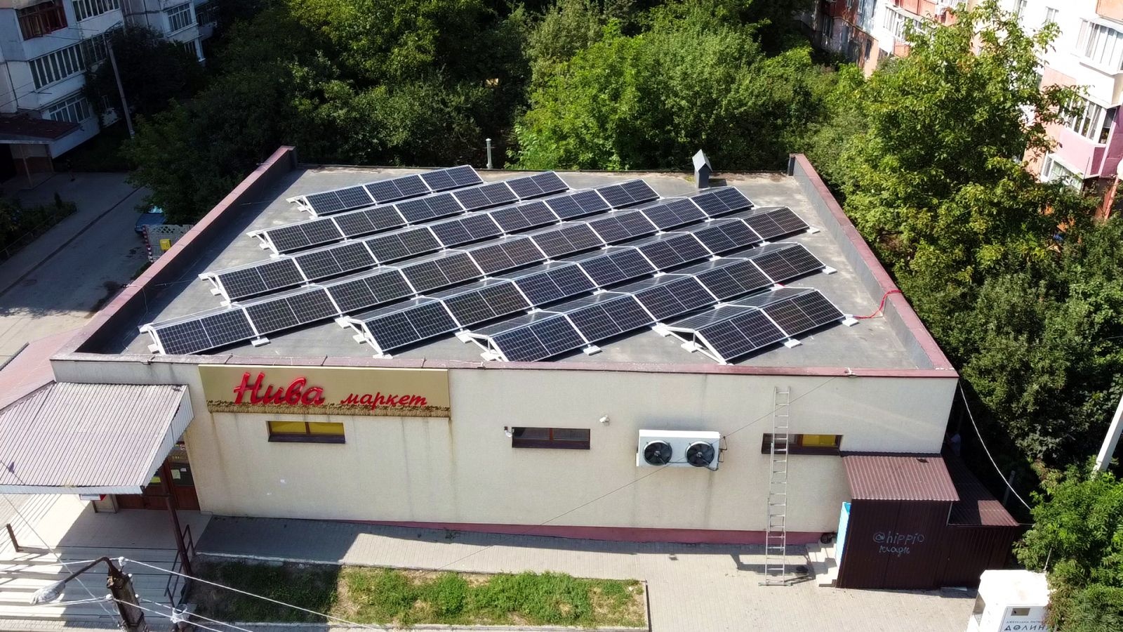 Станцию мощностью 40 кВт установили на крыше продовольственного магазина «Нива» в Черновцах для экономии энергопотребления. Установленное оборудование: - PV модули JA Solar 535W Mono Half-Cell; - инвертор HUAWEI SUN2000-30KTL-M3. Дело имели с плоской крышей, поэтому для монтажа фотомодулей использовали специальную балластную систему, которая не повреждает кровлю и при необходимости компенсирует угол крыши. Конструкция расположена под углом 20°, имеет двунаправленное расположение панелей к востоку и западу. |
